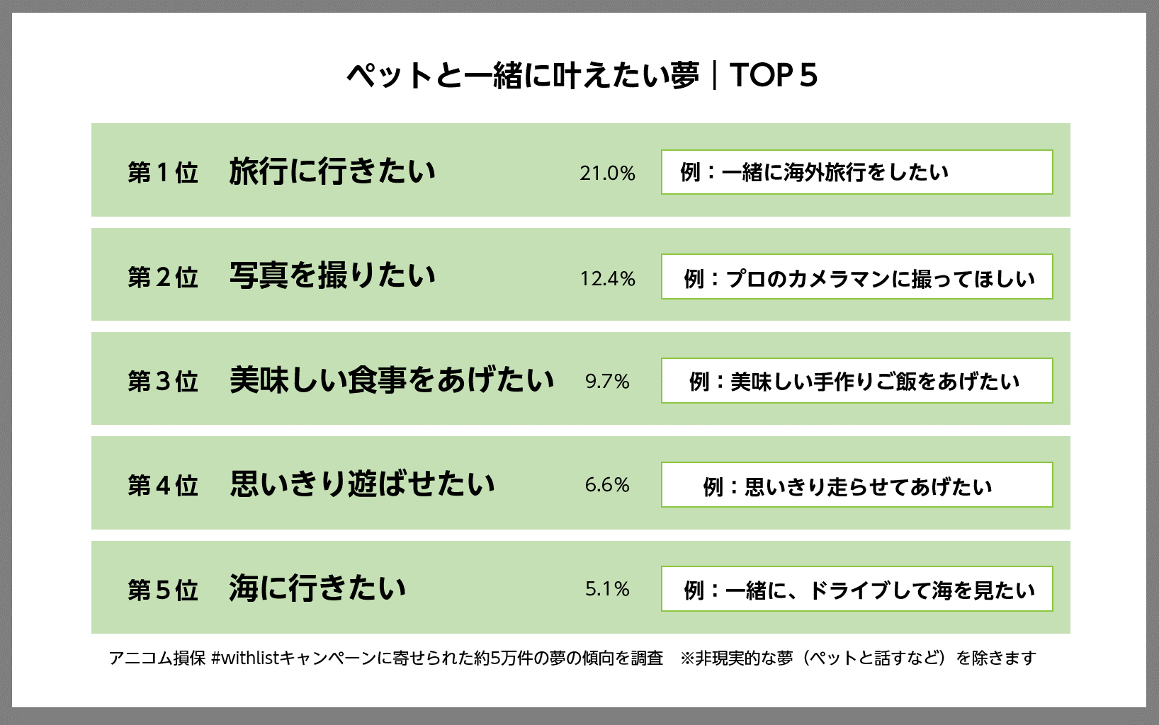 #withlistキャンペーンで集まった「ペットとさよならするまでにしたいこと」の夢のうち、現実的に叶う夢(「一生一緒にいる」、「ペットと話す」などを除外)に絞った結果を見てみると、1位は「旅行」でした。また、SNSの普及に伴い、素敵な写真を撮るといったニーズも強くあります。他にも、「美味しいごはんを食べさせてあげたい」といったニーズも多く、どれも「親子」や「夫婦」といった関係性にあてはめてもおかしくない夢が並びました。しかし、こうした素朴ともいえるニーズが「夢」という形で特筆されるのは、ペットにしてあげることが難しいから、という事実の裏返しかもしれません。使役動物(牧羊犬や狩猟犬といった目的を持ったパートナー)の時代から、家族化が進み、さらにこれからは「ペットとの共通体験」が求められる時代になりつつあるのではないかと考えられます。そこで、アニコムでは、これらの「共通体験」で人気だった夢を、実際に叶えるお手伝いをしました。